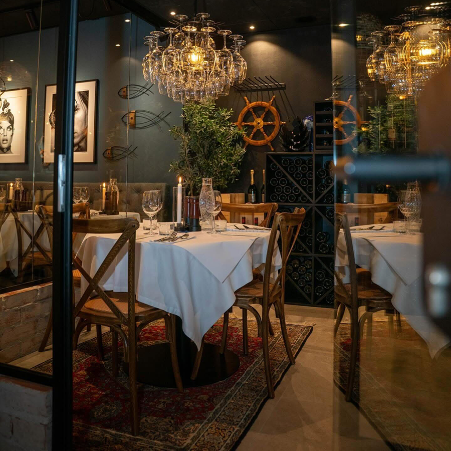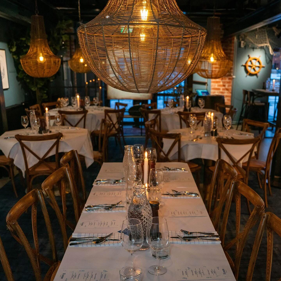 Miljön är stilfull men avslappnad, med en tydlig inspiration från kust och hav. Det är en plats som passar lika bra för en middag med vänner som för en dejt eller en längre kväll där både mat och umgänge får ta tid.